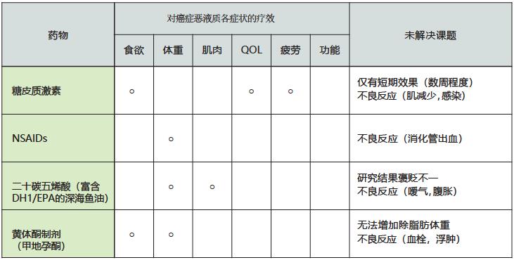 目前针对癌症taptap点点亚洲体育的药物很少,日本的Anamorelin是世界上第一个癌症恶液质药物,为了缓解恶 液质的症状世界各国多有使用糖皮质激素和黄体酮制剂的,有一定的效果,不良放映仍是待解决的课题(表)1-3。单独干预药物疗法无法获得充分的疗效,有必要与营养疗法和运动疗法组合使用4,5。