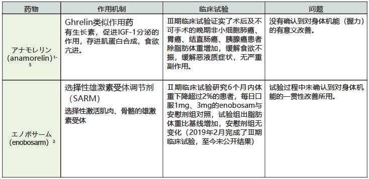 目前正在开发以改善癌症患者全身型炎症、体重下降、食欲不振的分子药物(表6)。Anamorelin是Ghrelin类似作用药物,大规模Ⅲ期临床试验显示安全性和疗效均好,于2021年1月已经 在日本上市,之后将陆续在美国和欧洲上市。据报道,虽然Anamorelin能帮助癌症恶液质患者增加体 重和骨骼肌量,但无法改善不行和握力1- 5,除了药物,癌症taptap点点亚洲体育的治疗仍然有必要结合营养疗法和运动疗法。