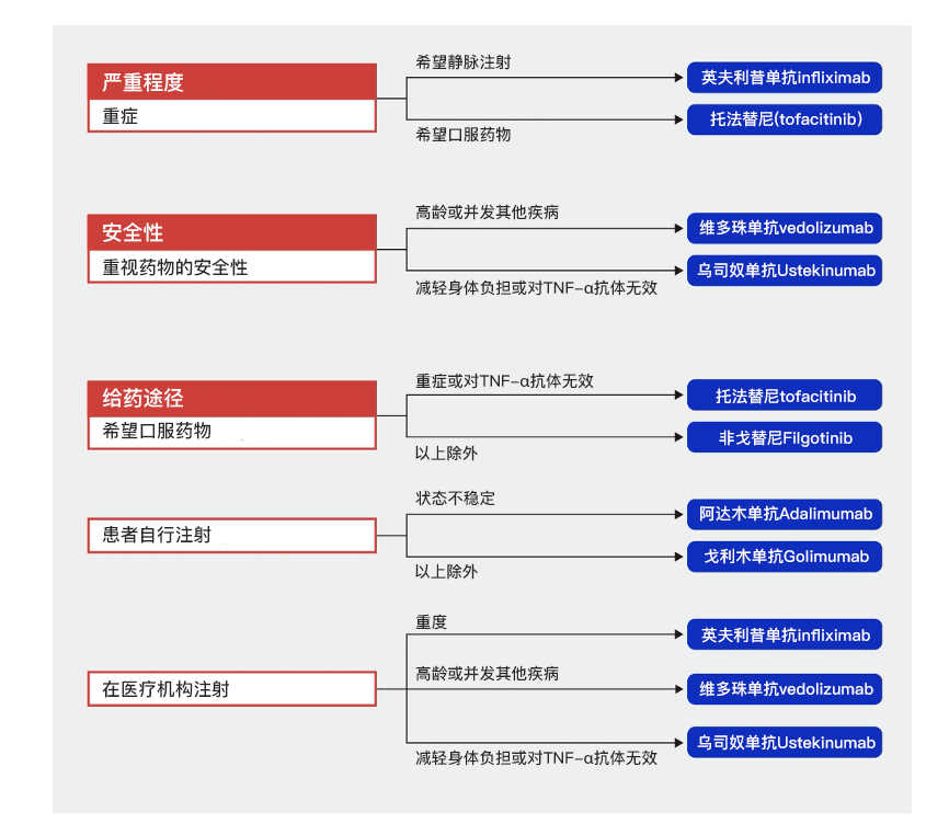 溃疡性结肠炎(UC)的治疗尚未确立明确的药物选择准则。图2是日本专家基于每个药物的特点总结的药物选择流程,可供参考。