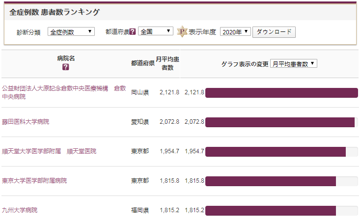 2020年就诊患者总人数位于全日本第二(日平均门诊人数3200人/住院人数1300人),超出日本东京顺天堂医院,连续多年被日本厚生劳动省评为全日本大学医院综合排名第一的医疗机构。