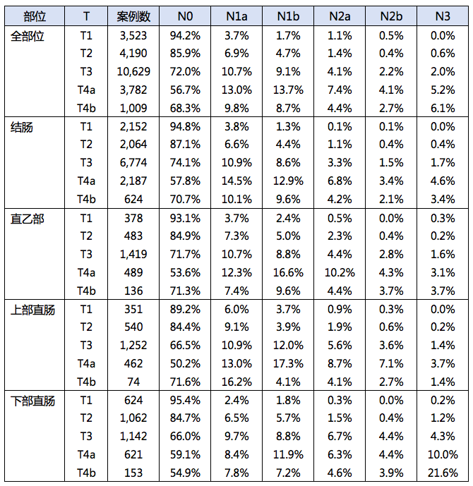 结直肠癌各部位管壁浸润程度的淋巴结转移频率(日本大肠癌研究会登记的全国2000~2007年确诊患者)