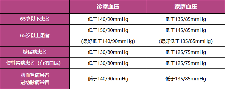 通常降压目标设定为140/90 mmHg,合并有蛋白尿慢性肾病(CKD)和糖尿病(肾衰竭高风险因素)的患者,降压目标设定为130/80 mmHg。