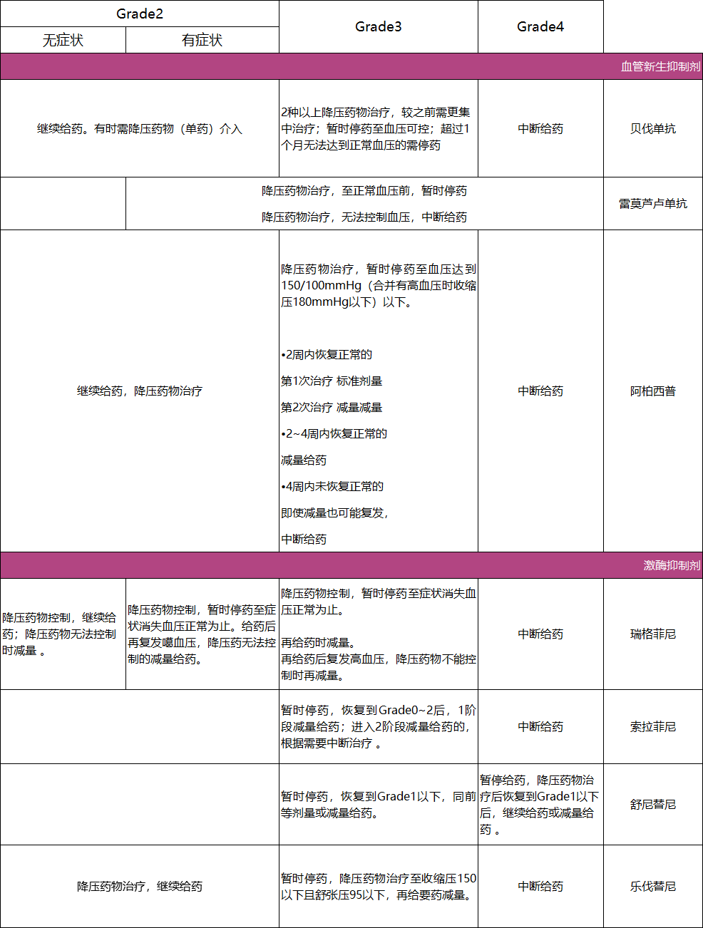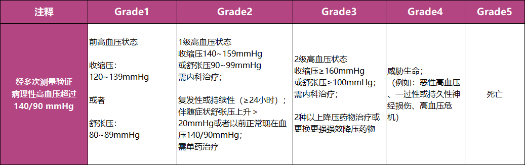 与高血压治疗指南的降压目标一致,使用降压药物的标准临界点为Grade2(收缩压140~159 mmHg或舒张压90~99 mmHg)。如果在服用降压药物后仍出现Grade3的高血压,推荐增加降压药物的种类或更换其他药物。