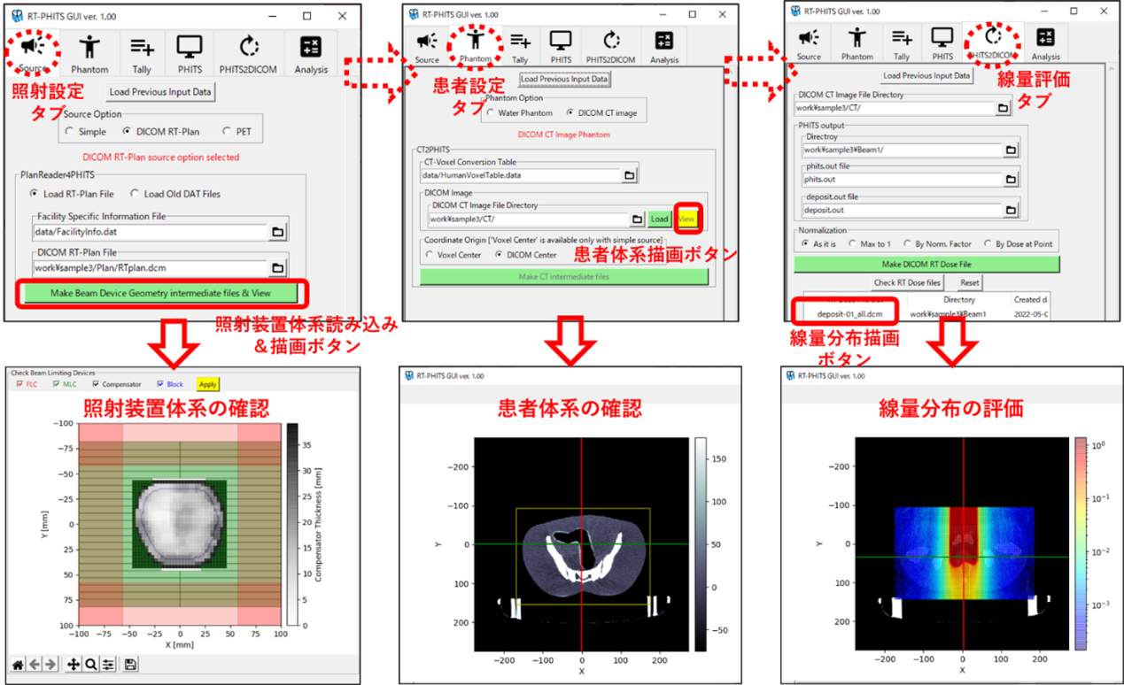 图2显示了所开发的RT-PHITS for CIRT系统概况。该系统还具有将PHITS计算得出的剂量分布转换为DICOM数据的功能,因此它可以与一般的治疗计划支持设备一起使用,在患者CT图像上绘制剂量分布图,并与治疗计划系统的剂量分布进行比较。这样就可以进行详细的分析。RT-PHITS for CIRT有自己的图形用户界面(GUI),通过直观的操作、对辐照装置和病人系统的视觉确认以及对剂量分布的评估,使配置变得简单。(图3)