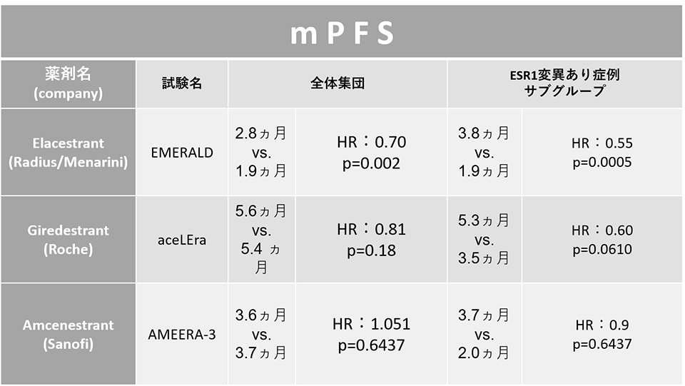 口服SERD的开发目前处于第一线,一些一线治疗III期试验正在进行中,但这些结果给它们蒙上了一层阴影。口服SERD在ESR1突变病例中的疗效一直被认为是合理的。但是,未来,我们将等待目前正在进行的 III 期对比试验的结果,看看它是否真的比现有的 AI 等内分泌疗法和氟维司群更有效。(AMEERA-5 试验已被宣布为阴性试验。)
