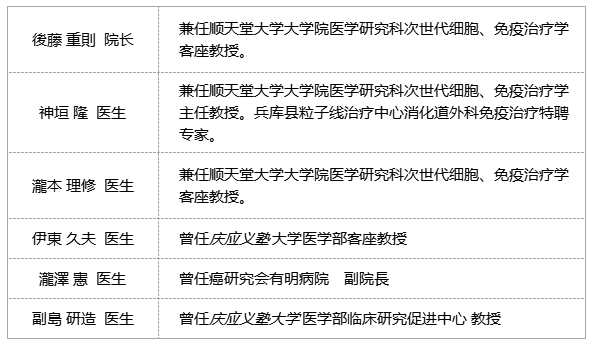 医生均为来自顺天堂大学医院、庆应义塾大学医院及癌症研究会有明医院的肿瘤科医生。除了免疫细胞治疗外,还可以为患者提供手术、化疗、放疗以及姑息治疗的综合诊疗意见。