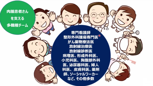 肉瘤是一种罕见病,具有多种组织学类型、基因异常类型、发病年龄和发病部位。多学科团队的诊断和治疗非常重要,包括医院内,甚至是其他医院的病理医生、基因学医生、儿科医生、老年科医生和各器官的专家。