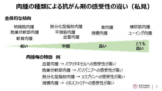 透明细胞肉瘤、肺泡软组织肉瘤和软骨肉瘤的敏感性较低。但它们也有其自身的特性。比如,肺泡软组织肉瘤对帕索帕尼高度敏感,去分化脂肪肉瘤对艾日布林高度敏感,滑膜肉瘤对异环磷酰胺高度敏感。