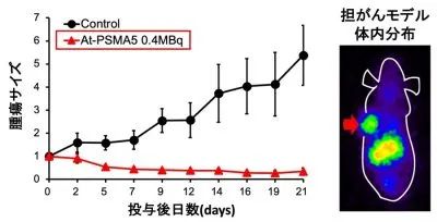 在这项研究中,给前列腺癌模型小鼠静脉注射“砹-211”标记的PSMA5配体进行靶向α放疗时,发现该核素在肿瘤中高度积累,并证实单次给药具有持久的肿瘤消退效果。
