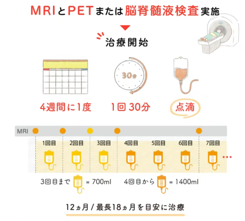 每四周进行一次,每次输液30分钟。预计治疗周期为12个月,最长可达18个月。