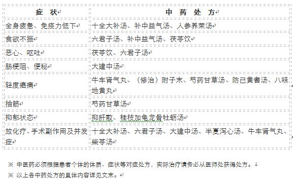 癌细胞可以用多种形式夺走患者的健康。疲倦、食欲不振、免疫力低下等为患者带来烦恼,这些烦恼必定会进一步造成患者体力和精神损失,从而为癌细胞创造良好的生存环境。为了营造能遏制癌细胞环境,患者需要修复和调整身心到一个良好的状态,中药也是调整整体状态的补药。最具代表性的补药是十全大补汤和补中益气汤,人参养荣汤也是癌症患者经常服用的补药。下表按癌症的进展程度举例推荐一些中医药剂。