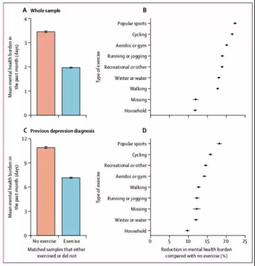 在《柳叶刀-精神病学》上发表的一项最新大样本研究明确指出:运动人群的心理压力比不运动的人群更小,更不容易抑郁。