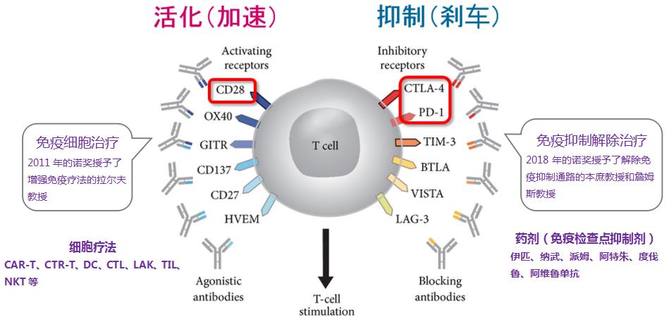 如上图所示,目前的癌症免疫治疗主要围绕T细胞展开,解除T细胞的免疫抑制(图右侧),或者增强T细胞的攻击能力(图左侧)。