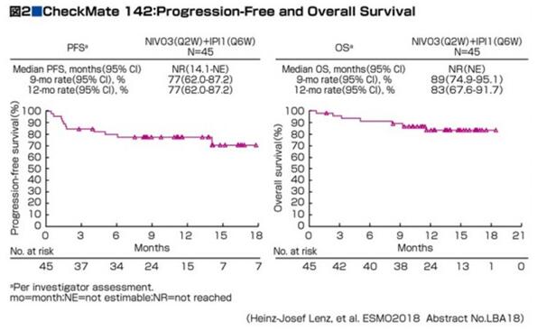 未达到无进展生存期PFS的中央值,12个月的PFS率为77%,为达到OS中央值(NE),12个月的OS率为83%(图2)。