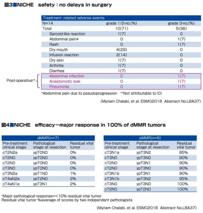 关于有效性,dMMR的患者7人中4人(57%)PCR,其余3人术后检查残存肿瘤1%或2%。dMMR患者中,4人的肿瘤在治疗前为IIIB或IIIC期。在pMMR患者中,残存肿瘤在85%~100%之间,几乎无效(图4)。