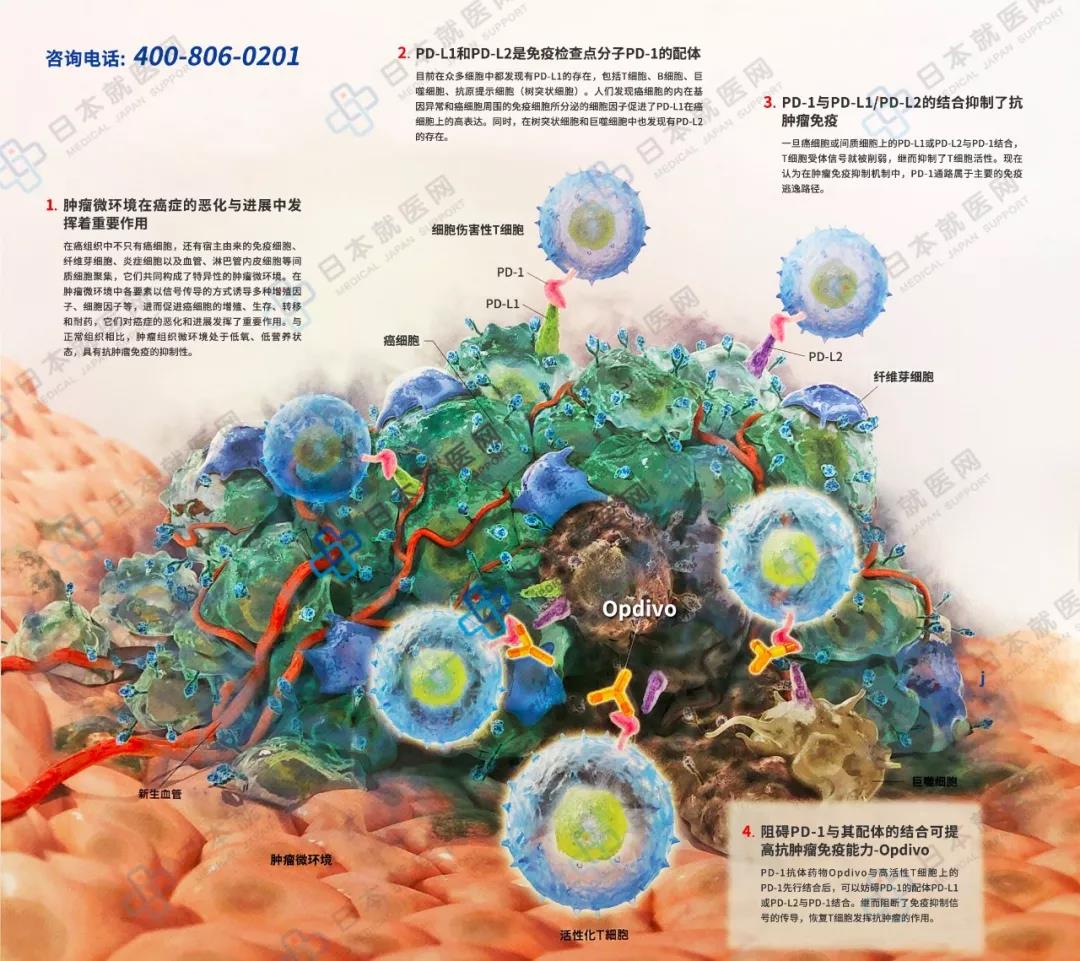 抗PD-1抗体药物Opdivo是与活性T细胞上的PD-1结合的抗体药物。它与PD-1受体结合后,可以阻挡PD-L1或PD-L2与PD-1结合,妨碍抑制信号的传递,接触T细胞的免疫抑制,从而促进机体恢复正常的免疫反应(正常的活性T细胞诱导癌细胞凋亡)。