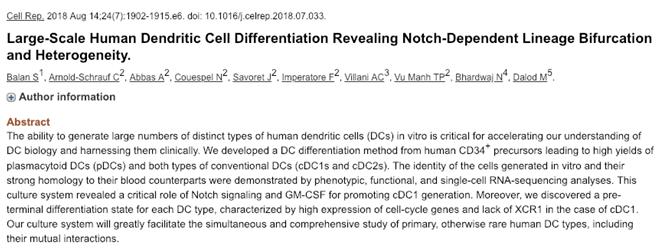 此外,该研究还突出了notch信号的作用,notch信号是一种生物学途径,在从苍蝇到人类的多种生物体的发展中起着关键作用,并且对于产生一种特定类型的树突状细胞(即cDC1)至关重要,而这种细胞是研制肿瘤疫苗的最佳树突状细胞。