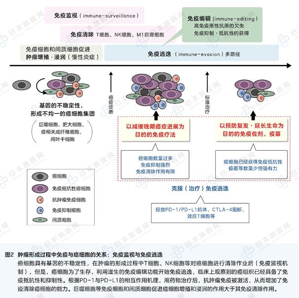 为了理解癌细胞和免疫的相互作用,我们把肿瘤与免疫的关系分为两个阶段来考虑,第一阶段是单一的正常细胞经过长期的生长增殖转变成癌细胞的“免疫病理阶段”;第二阶段是在多种因素作用下癌细胞从免疫防御中逃逸,在临床上被诊断为癌症的“病理阶段”(图2)。在第一阶段中,T细胞、NK细胞等为主体发挥免疫监视功能,在慢性炎症中,主要由巨噬细胞等自然免疫包促进了细胞的变异、增殖、生存、浸润和新生血管(在癌组织内为癌细胞提供养料的血管)的发生,癌细胞自身的免疫编辑功能又进一步完善了免疫抵抗性,从而发生免疫逃逸,具有抵抗性的癌细胞存活下来并增殖。在第二阶段中,在肿瘤微环境中癌细胞增殖并营造免疫抑制环境,以癌细胞的基因异常为起点的免疫抑制,以及以抗肿瘤T细胞为起点的免疫抑制并存。因此,免疫疗法需要制定综合治疗战略,应对不同阶段,不同原因造成的病理变化。