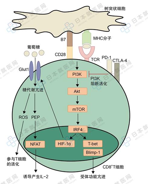 T细胞在树突状细胞的抗原刺激下被激活,在mTOR等多重因素作用下,葡萄糖代谢亢进。糖代谢的亢进可以增强T细胞的活性、促进其分化和增殖。但是PD-1、CTLA-4可以干扰糖代谢,使糖代谢功能降低。实际上使用抗PD-1抗体药物后,可以增强糖代谢的亢进,糖代谢的产物进一步有维持T细胞活性的作用(图)。反之,阻断ROS路径却降低了CTL的数量。