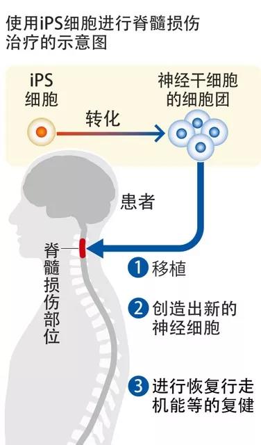 计划中,将把iPS细胞转化为神经干细胞,移植至损伤后2周至4周的“亚急性期”患者体内。对于伤处以下均失去知觉及运动机能、处于“完全麻痹”状态的伤情最严重患者,则目标恢复其神经的功能。