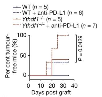 “当我们将YTHDF1敲除与PD-L1抗体联合使用时,我们几乎控制住了所有小鼠的肿瘤,”何川说。