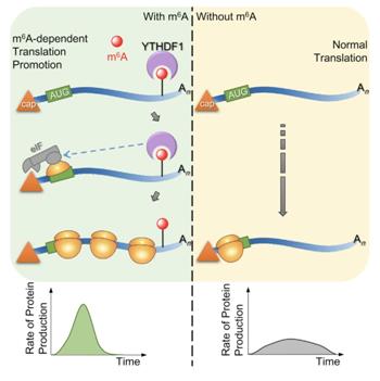 不过,早在2015年,何川团队就发现m6A修饰后的mRNA通过与YTHDF1结合影响基因的翻译效率。
