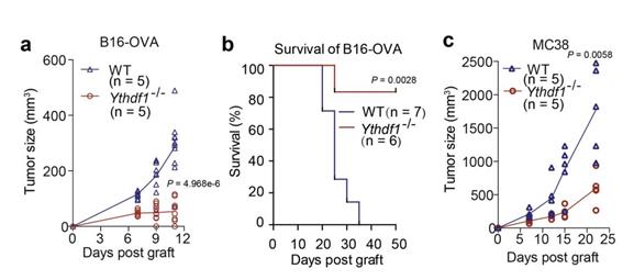 研究人员将黑色素瘤和肠癌细胞分别接种到YTHDF1基因敲除和野生型小鼠身上。在两种癌症模型小鼠身上,研究人员都观察到了YTHDF1基因敲除小鼠肿瘤的大小远小于野生型,而且YTHDF1缺陷型小鼠身上肿瘤抗原特异性CD8阳性T细胞和NK细胞的反应也更猛烈。