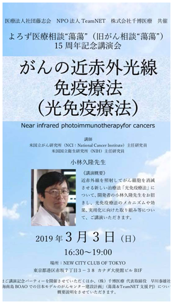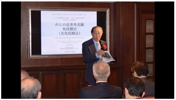 纪念演讲会邀请了现在极受关注的光免疫疗法开发者小林久隆医生(美国国立癌症研究所主任研究院),小林医生以“癌症的近红外线免疫疗法”为题做了演讲,介绍了最近的成果,治疗机理以及实际病例,并与在场诸位肿瘤专家交换意见。