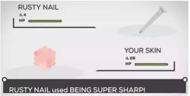 一天,你突然不小心用生锈的钉子误伤了自己,免疫系统的第一关卡被突破:你的皮肤。邻近细菌趁这个机会进入你的伤口,它们开始利用你身体的资源,以约20分钟翻一倍的速度增长。