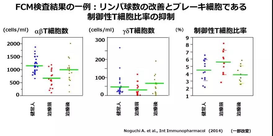 上图中绿色横线为平均数值,该患者治疗后αβT细胞的平均数接近于健康人,γδT细胞的平均数高于健康人,而抑制性T细胞的水平略低于健康人的状态。这样,该患者机体内的抗肿瘤免疫应答能力比治疗前显著增强了。