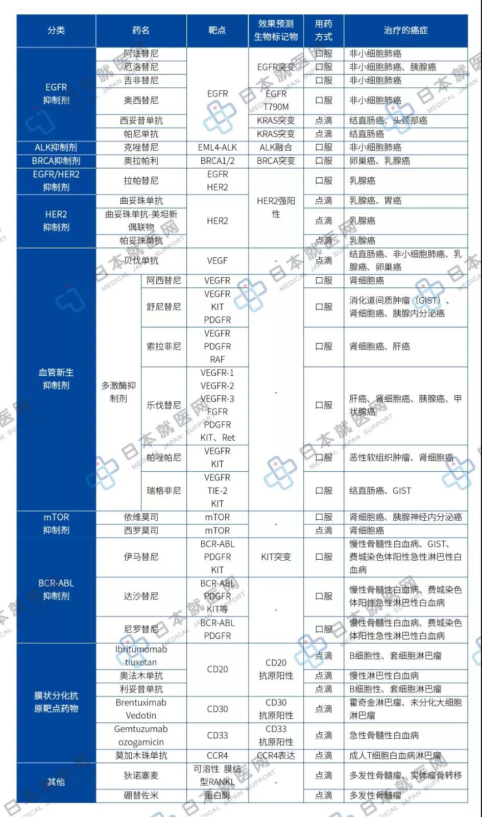 在日本,癌症治疗学会以及各肿瘤分科学会制定的治疗指南对靶向药物的使用做了标准化规定,本文仅对常用靶向药物做说明。