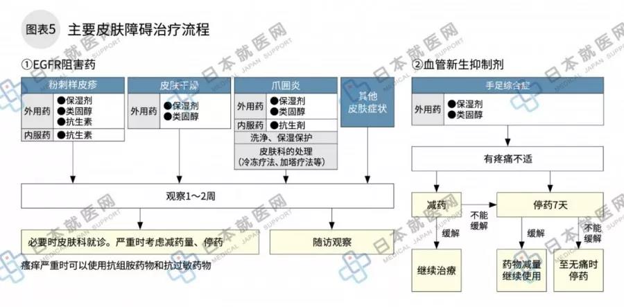 ①的患者出现皮肤障碍后药物治疗基本有效,出现粉刺样皮疹等不必换乱,即使出现更严重过的情况,导入皮肤治疗后,可以继续使用靶向药物治疗肿瘤(图表4)。