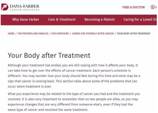丹纳法伯癌症中心和美国各大癌症中心都会在网站上为患者和患者看护人准备癌症治疗前后需要的注意事项、身体会发生的变化、可预料到的副作用、如何通过饮食来缓解不适等。