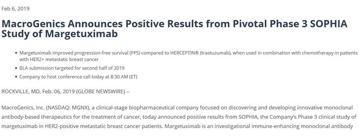 SOPHIA-3是2018年1月美国FDA认证的抗HER2阳性抗体药物margetuximab+化疗,与曲妥珠单抗(赫赛汀)+化疗的对比试验。试验结果显示margetuximab+化疗组总生存期(OS)比曲妥珠单抗+化疗组的更优越。该研究结果公布于ASCO2019(美国临床肿瘤学会)。