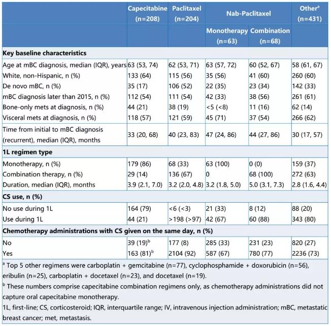 大多数接受卡培他滨治疗的患者在一线治疗期间未接受CS治疗(79%),而接受紫杉醇和nab-紫杉醇的大多数患者接受CS治疗(分别>95%和78%)。然而,在接受nab-紫杉醇治疗的患者中,接受联合治疗方案的患者(88%)在一线治疗期间使用CS的频率高于接受单药治疗的患者(67%)。