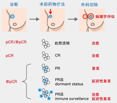 微转移的转归不外乎以下5种情况:①自然清除;②药物疗法奏效(CR)的完全清除;③药物疗法部分奏效(PR)有肿瘤残留;④PR残留或者癌细胞进入休眠状态(dormant status)后将来某时复燃;⑤PR残留且免疫监视对肿瘤有效抑制。其中③~⑤毋庸置疑的存在复发风险,常规方法监视和检测微转移也非常困难。因此,术前使用药物治疗后再切除,通过病理学评估患者获得完全缓解(pCR)的,则认为且只能认为该患者已经获得了无微转移的CR(事实并非如此);术后认为未获得pCR的,考虑追加术后疗法(卡培他滨,TDM-1等)。参见图1.