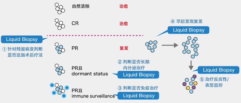 ctNDA也有望用于乳腺癌治疗后发生微转移的早期复发预测(图2-④)。然而,早期检测出因微小转移存在复发风险的,预防复发的医疗改善手段很有限,临床医生需要警惕,不能随意延长药物治疗时间。预防复发的实际手段中,我们更寄希望于副作用更少的生物疗法。