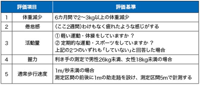 伴随老龄化的发展,该比例逐年增加。根据日本心血管健康研究(J-CHS)的标准,具备以下5个评估项目中的3个,即可诊断为老年衰弱综合征。(参考图表2)
