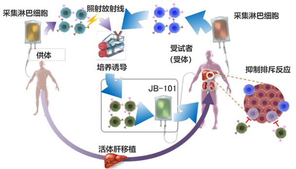 此次临床试验征得患者同意后将在实施肝移植前的观察期进行筛查,以确认是否适合参加临床试验,然后利用单采术(Apheresis)在实施肝移植的14天前~3天前从供体、在实施肝移植的前一天从受试者体内采集外周血单核细胞。将从供体和受试者体内采集的白细胞中的单核细胞与CD80/CD86抗体(激活T细胞的分子)进行共培养,培养的单核细胞会转化成保护供体组织免受排斥的细胞(诱导型抑制性T细胞“JB-101”)。
