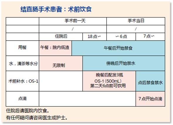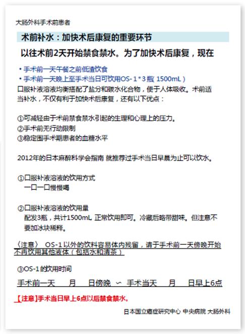 日本国立癌症研究中心中央病院的大肠外科手术患者一直到手术前一天的午餐为止可以低渣饮食,从前一天的晚上18点以后到手术当天早上6点,可饮用口服补水补液「OS-1」1,500mL。