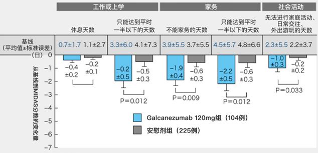 与安慰剂组相比,Galcanezumab组在劳动生产率、日常生活影响・失能程度等方面均有明显改善(图2)。
