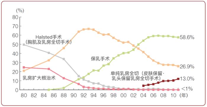 保乳术(包括手术+放疗)与全乳房切除术的治疗效果相当,目前采用保乳术治疗乳腺癌的比例越来越大(图2)。