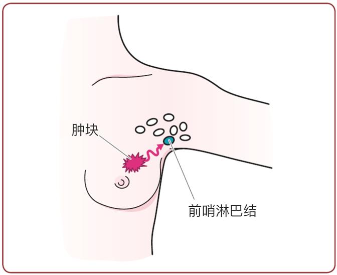 乳腺癌发生转移时,癌细胞首先从乳房内部到达的淋巴结被定义为前哨淋巴结。发现并切除前哨淋巴结后用显微镜检查是否存在癌细胞的一连串检查叫做前哨淋巴结活检(图1)。