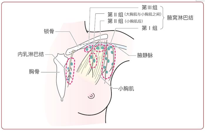 腋窝淋巴结是乳腺癌发生淋巴结转移时转移频率最高的淋巴结。腋窝淋巴结埋藏于腋窝脂肪内,为了完整地清扫腋窝淋巴结,腋窝淋巴结廓清需要切除腋窝下的一块脂肪。在切下的脂肪中寻找淋巴结,然后用显微镜做病理学诊断来确定有无转移的发生。有腋窝淋巴结转移的比没有转移的,在术后发生其他脏器转移的风险更高。