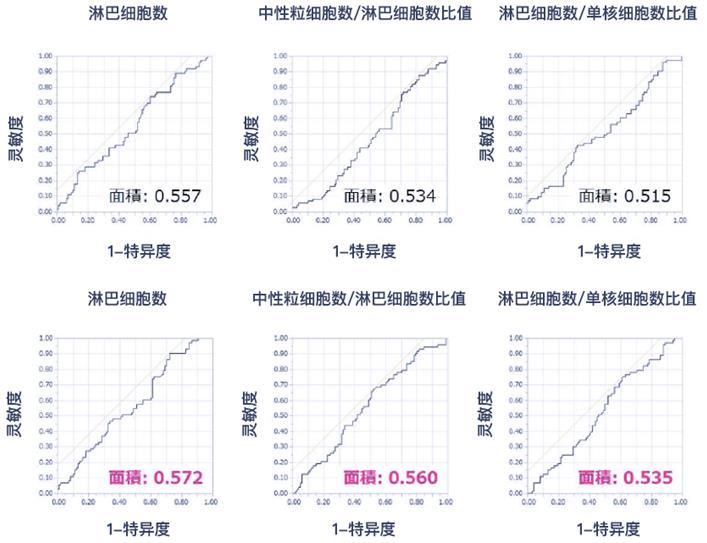 研究团队在此基础上进一步验证了irAE与末梢血细胞数量的关联性。通过对比Opdivo治疗前(图-上)与治疗2周后(图-下)的受试者工作特征曲线(ROS),发现治疗2周后的ROS曲线下面积相比治疗前稍大。ROS曲线显示,Opdivo治疗开始2周后的淋巴细胞数、中性粒细胞数/淋巴细胞数比值、淋巴细胞数/单核细胞数的临界值(cutoff value)分别为820(单位:cells/mm3)、4.3和2.2。
