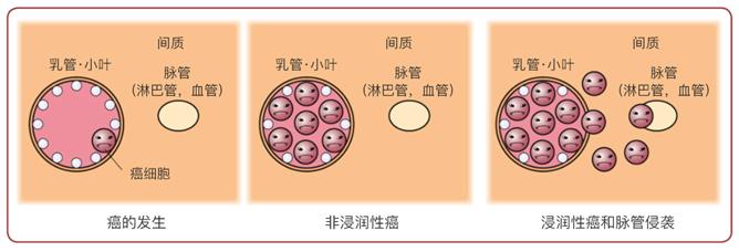 大多数浸润性乳腺癌发生在分泌乳汁的乳腺组织最外围部位(从乳管外围到小叶的部分),随着时间的推移,在导管和小叶周围得间质中扩散(图1)。癌细胞在乳管和小叶间的间质间扩散被称为“浸润”。根据是否发生浸润,乳腺癌大致可分为浸润乳腺癌和非浸润乳腺癌。非浸润乳腺癌的癌细胞局限于乳管和小叶内,规范治疗后几乎不会发生复发和转移;浸润癌已经超出了乳管和小叶的范围,这样的癌通过脉管侵袭具备复发转移的风险。