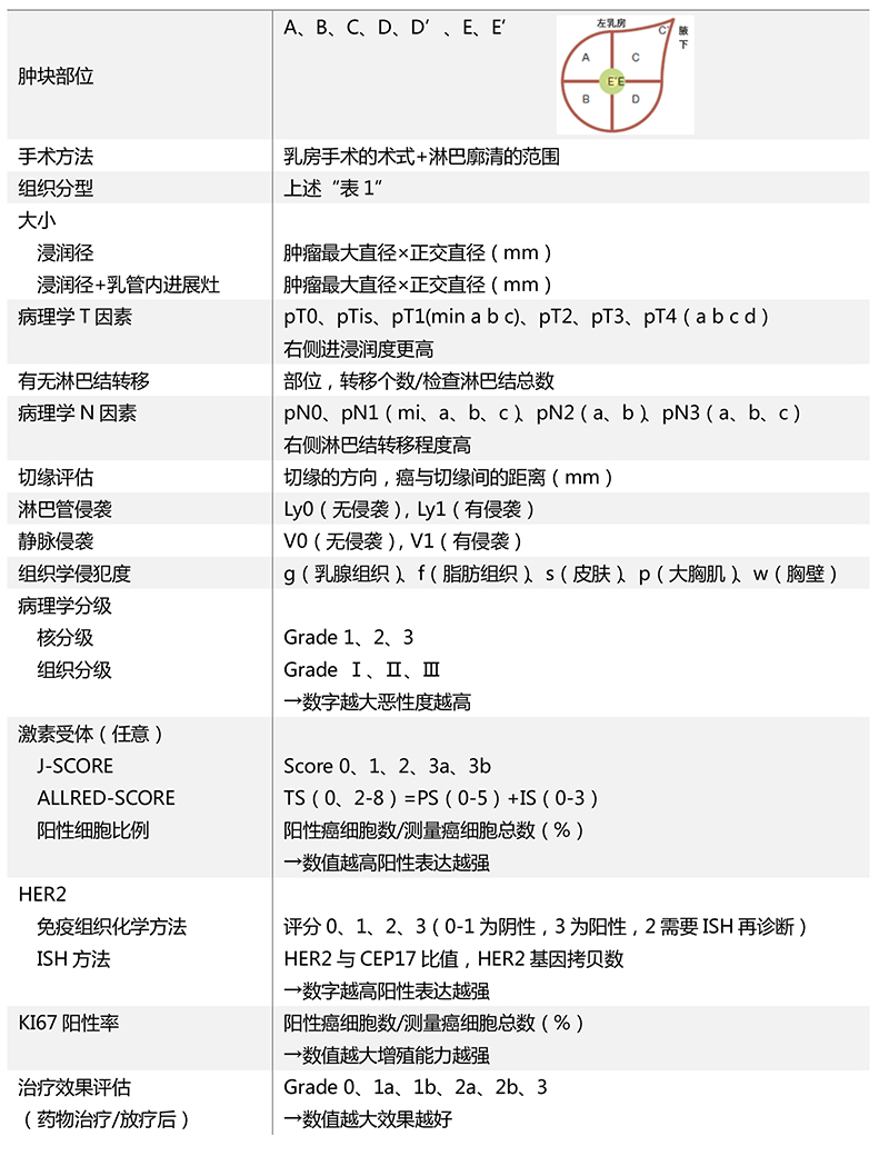 病理检查可以查明乳腺癌有无浸润、肿瘤大小、癌的分型(表1)、恶性度(Grade)、增殖能力(Ki67)、淋巴结转移和脉管侵袭情况,以及激素受体、HER2为阳性还是阴性。表2列出了一个比较完善的乳腺癌病理诊断内容。根据病理检查的结果,结合患者年龄、月经状况可以做出术前、术后的治疗策略。在癌症的组织分型中,将罕见的癌作为特殊类型区分,特殊类型的乳腺癌与常见的浸润性乳腺癌性质不同。对于罕见分类的癌,需要根据其性质选择治疗方法。