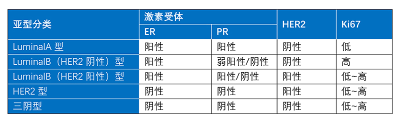 实际上要明确乳腺癌的类型,需要做基因检测,现实中并不是每位患者都接受基因检测的,因此,根据免疫组织化学的诊断结果,对乳腺癌做大致的分类,叫做亚型分类(表3)。