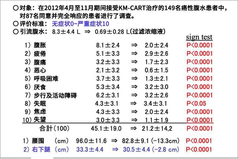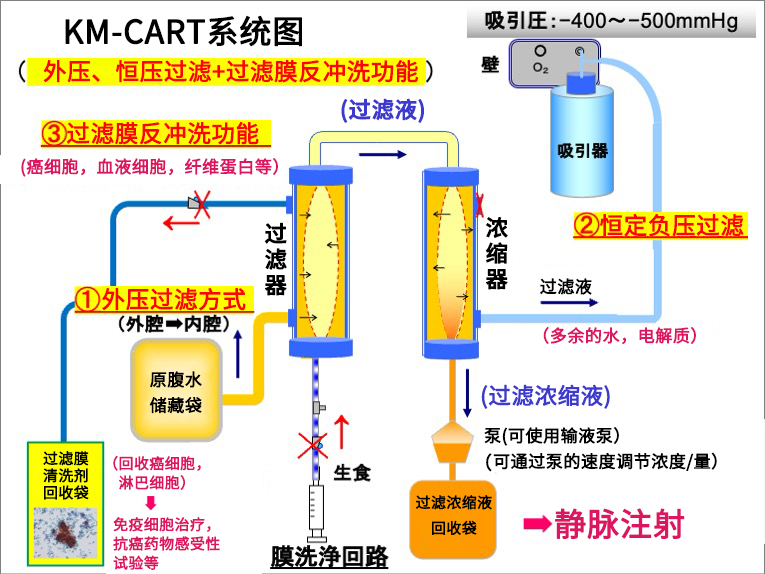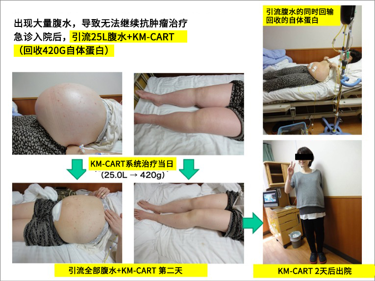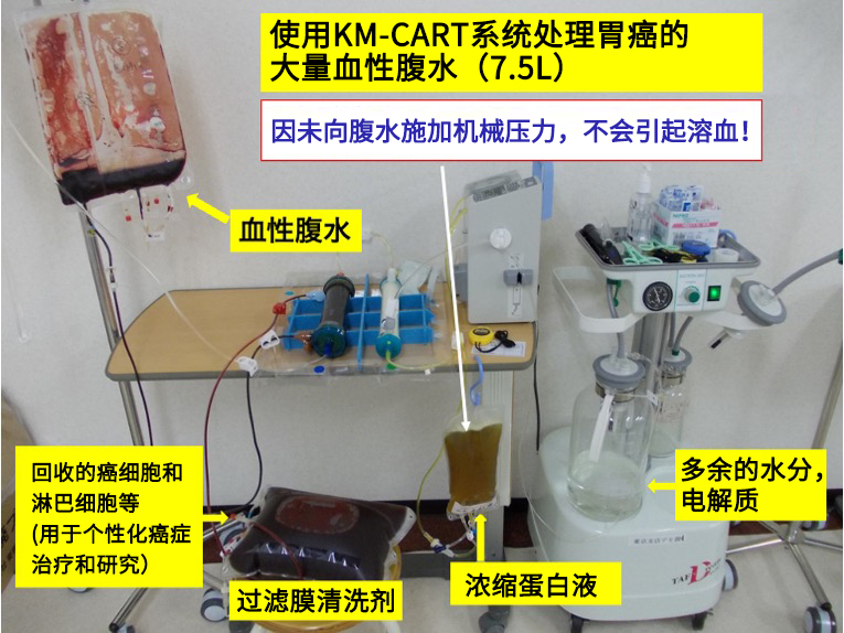 癌症晚期或肝硬化的患者往往会出现大量腹水,这可能导致无法继续进行抗癌药物治疗。直到现在,腹水仍然没有得到积极的治疗,因为人们普遍认为“引流腹水会让患者更加虚弱”,“一次性引流过多腹水会危及生命”。 而日本东京要町医院腹水治疗中心主任-松崎圭介推翻了这一观点。他开发的KM(Keisuke Matsusaki)-CART(腹水过滤浓缩回收)系统自2009年至今已经治疗了9000多例腹水患者。