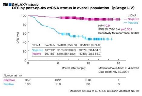 参与研究的1040 名患者中,术后 4 周ctDNA 呈阴性患者852 名,阳性患者188 名。主要终点为无病生存期(DFS),所有患者(pstage 1~4)的风险比为 10.9(95% CI:7.8~15.4),p <0.001(图 5)。提示术后4 周 ctDNA 阳性患者复发风险显著增加。